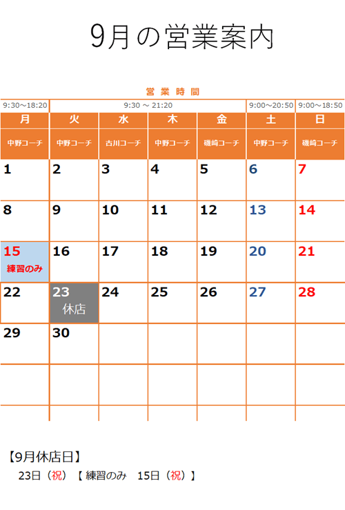 9月の営業案内 2025年8月28日 カテゴリーお知らせ カレンダー, 営業関連 休業日 9/23(火) スクール・レッスンの営業 【休講日】 スクール休講日は、スクール、チケットのレッスン、都度レッスンの受講はできません。練習利用、体験レッスン、練習通い放題コースの体験のみとなっております。 9/15(月)はスクールは休講です。9時~19時で練習利用のみとなります。都度レッスン、チケットのレッスンも受講もできません。 共有: クリックして X で共有 (新しいウィンドウで開きます) X 関連 8月の営業案内 10月の営業案内