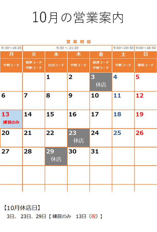 10月の営業案内 2025年9月19日 カテゴリーお知らせ カレンダー, 営業関連 休業日 10/3(金) 10/23(木) 10/29(水) スクール・レッスンの営業 【休講日】 スクール休講日は、スクール、チケットのレッスン、都度レッスンの受講はできません。練習利用、体験レッスン、練習通い放題コースの体験のみとなっております。 10/13(月祝)はスクールは休講です。9時~19時で練習利用のみとなります。都度レッスン、チケットのレッスンも受講もできません。 共有: クリックして X で共有 (新しいウィンドウで開きます) X 関連 9月の営業案内 11月の営業案内