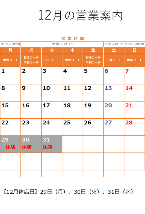 12月の営業案内 2025年11月26日 カテゴリーお知らせ カレンダー, 営業関連 休業日 12/29(月)~12/31(水) スクール・レッスンの営業 【休講日】 スクール休講日は、スクール、チケットのレッスン、都度レッスンの受講はできません。練習利用、体験レッスン、練習通い放題コースの体験のみとなっております。 なし 共有: クリックして X で共有 (新しいウィンドウで開きます) X 関連 11月の営業案内 1月の営業案内