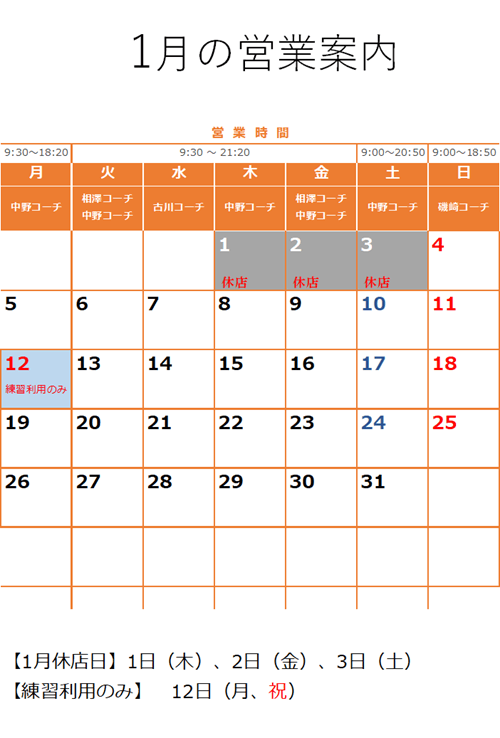 1月の営業案内 2025年12月23日 カテゴリーお知らせ カレンダー, 営業関連 休業日 1/1(木)~1/3(土) スクール・レッスンの営業 【休講日】 スクール休講日は、スクール、チケットのレッスン、都度レッスンの受講はできません。練習利用、体験レッスン、練習通い放題コースの体験のみとなっております。 1/12(月祝)はスクールは休講です。9時~19時で練習利用のみとなります。都度レッスン、チケットのレッスンも受講もできません。 共有: クリックして X で共有 (新しいウィンドウで開きます) X 関連 12月の営業案内
