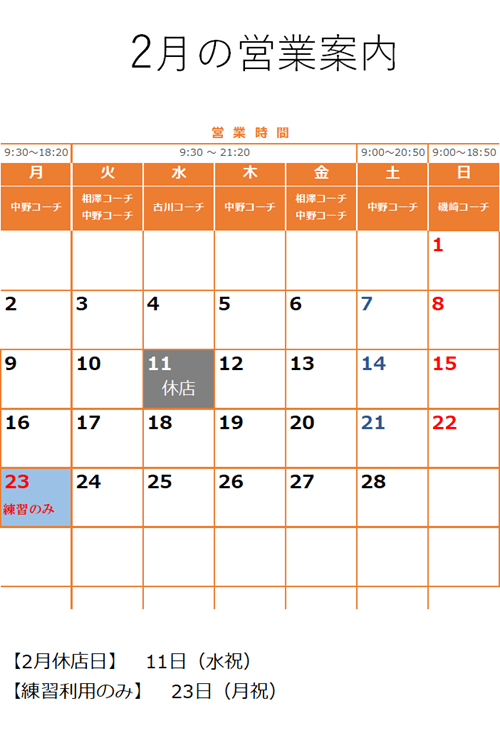 2月の営業案内 2026年1月21日 カテゴリーお知らせ カレンダー, 営業関連 休業日 2/11(水祝) スクール・レッスンの営業 【休講日】 スクール休講日は、スクール、チケットのレッスン、都度レッスンの受講はできません。練習利用、体験レッスン、練習通い放題コースの体験のみとなっております。 2/23(月祝)はスクールは休講です。9時~19時で練習利用のみとなります。都度レッスン、チケットのレッスンも受講もできません。 共有: クリックして X で共有 (新しいウィンドウで開きます) X 関連 1月の営業案内