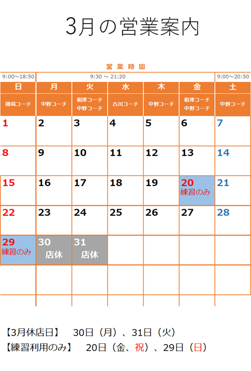 3月の営業案内 2026年2月19日 カテゴリーお知らせ カレンダー, 営業関連 休業日 3/30(月) 3/31(火) スクール・レッスンの営業 【休講日】 スクール休講日は、スクール、チケットのレッスン、都度レッスンの受講はできません。練習利用、体験レッスン、練習通い放題コースの体験のみとなっております。 3/20(金祝)、3/29(日)はスクールは休講です。9時~19時で練習利用のみとなります。都度レッスン、チケットのレッスンも受講もできません。 共有: クリックして X で共有 (新しいウィンドウで開きます) X 関連 2月の営業案内