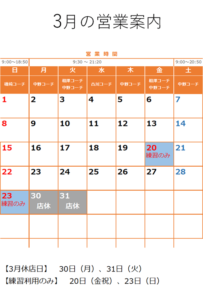 休業日 スクール・レッスンの営業 【休講日】 スクール休講日は、スクール、チケットのレッスン、都度レッスンの受講はできません。練習利用、体験 […]