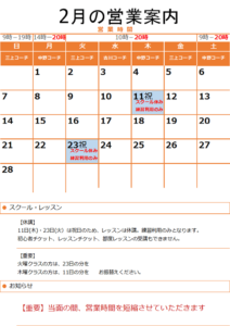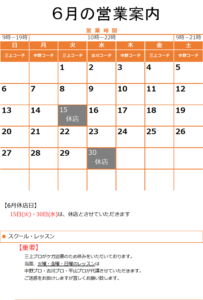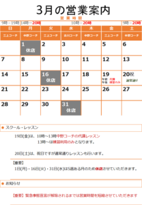 スクール・レッスンの営業 【休講日】 スクール休講日は、スクール、チケットのレッスン、都度レッスンの受講はできません。練習利用と体験レッスン […]