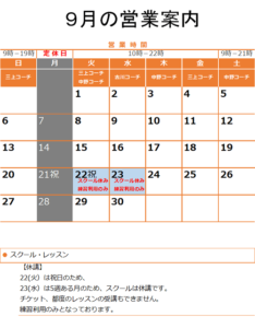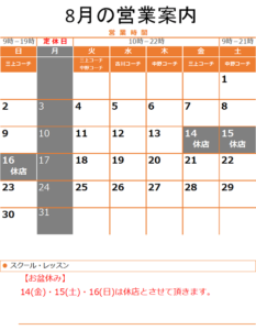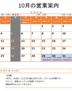 休業日 【定休日】 月曜日 【お盆休み】 8/14(金)~8/16(日) スクール・レッスンの営業 【休講日】 スクール休講日は、スクール、 […]