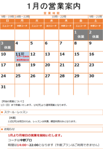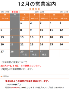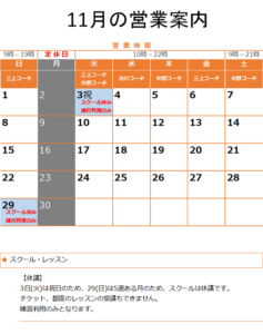 休業日 【定休日】 月曜日 【年末年始】 12/29(火)から1/3(日)まで スクール・レッスンの営業 【休講日】 スクール休講日は、スク […]