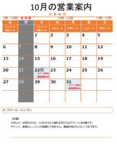 休業日 【定休日】 月曜日 スクール・レッスンの営業 【休講日】 スクール休講日は、スクール、チケットのレッスン、都度レッスンの受講はできま […]